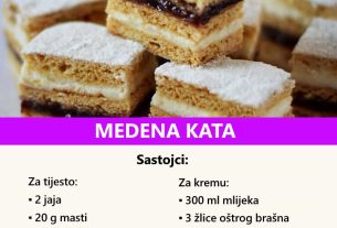 Pa pola tijesta od biskvita istresti u tepsiju koju ste pouljili i staviti u rernu da se malo zapeče. Oko 5 minuta na temperaturi od 180 C.