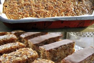 Staviti zadnju koru na papir za pecenje, brzo preliti karamelom, poravnati nozem i drugim narezanim nozem NAKVASENIM U HLADNOJ VODI -ODMAH oznaciti rezove i zatim odmah rezati sa korom.