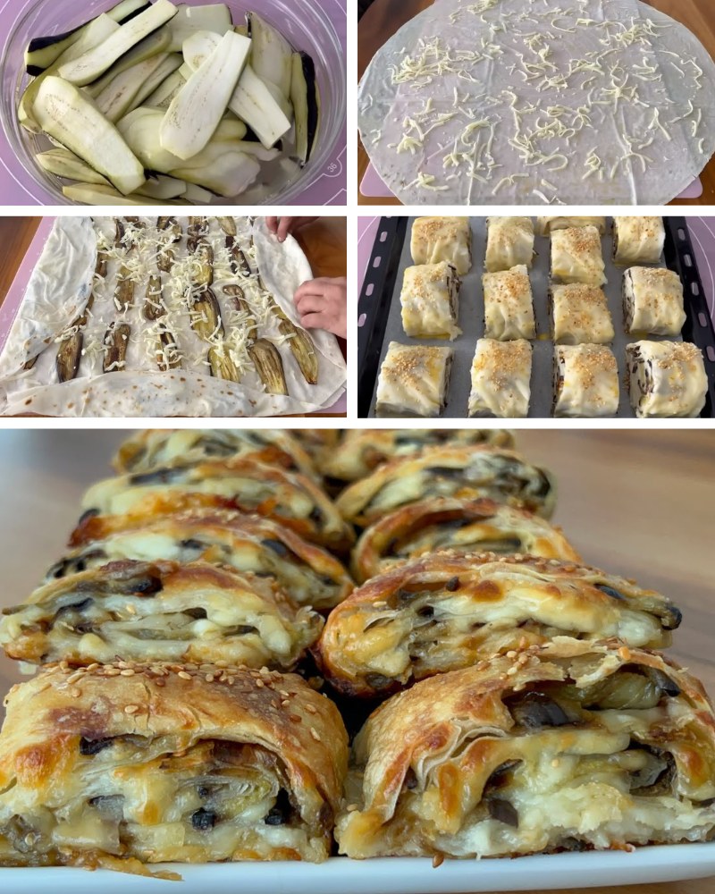 Preko rasporedite drugi list filo tijesta, premažite ga umakom i poredajte patlidžane po vrhu. Pospite cheddar sirom, preklopite rubove preko tijesta i zarolajte.