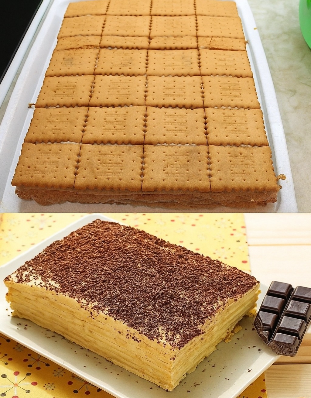 Pripremljeni puding ostavite sa strane da se ohladi. Zatim dodajte puter i dobro izmiksajte mikserom. Uzmite kekse i umočite ih u posudu sa 200 mililitara mleka, a zatim ih odmah izvadite i poređajte na poslužavnik. Kada je pleh napunjen, premažite deo fila preko keksa, pa nastavite sa slojevima preostalih keksa i fila na isti način.