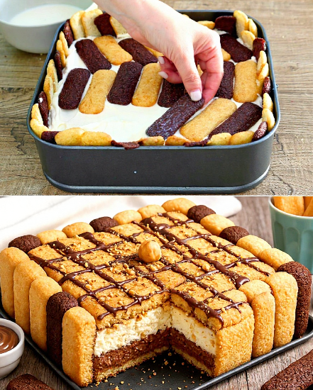 Na kremu stavite sloj klasičnih piškota, lagano umočenih u mlijeko. Preko keksa namažite običnu mascarpone kremu. Dodajte još jedan sloj keksa, opet naizmjenično po bojama radi kontrasta. Savijte kekse na rubovima prema unutra da zatvorite vrh. Stavite tortu u frižider da se hladi najmanje 2 sata.