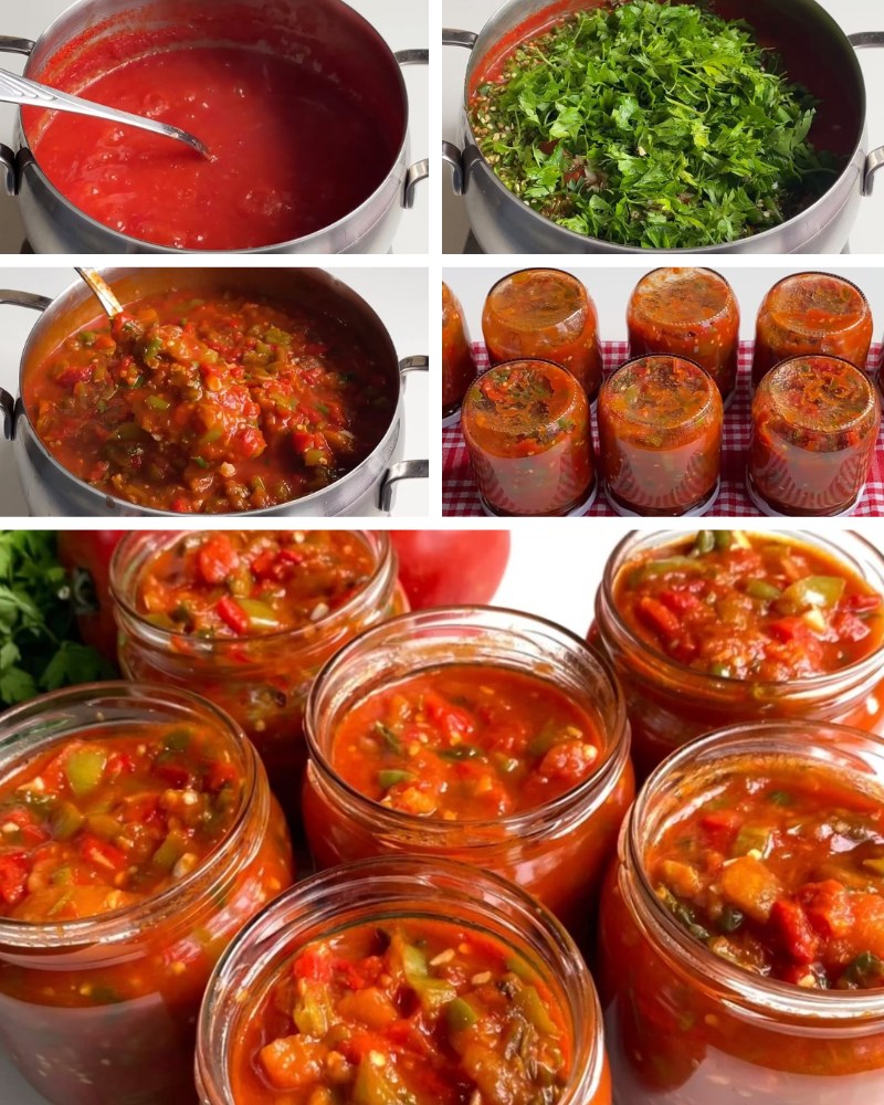 Dodajte kamenu so, ulje, šećer i jabučni ocat i kuhajte 2 minute. Dodajte patlidžan, papriku capia, ljutu papriku, slatku papriku, peršun i bijeli luk i promiješajte.