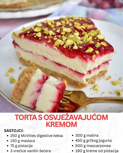 Ova torta je spoj hrskave podloge, kremastog fila i osvežavajućeg voćnog preljeva. Svaki sloj doprinosi ukupnom iskustvu: podloga daje kontrast kremi, maline unose kiselo-slatku notu, a pistacija i mascarpone krem daju bogat i sofisticiran ukus.