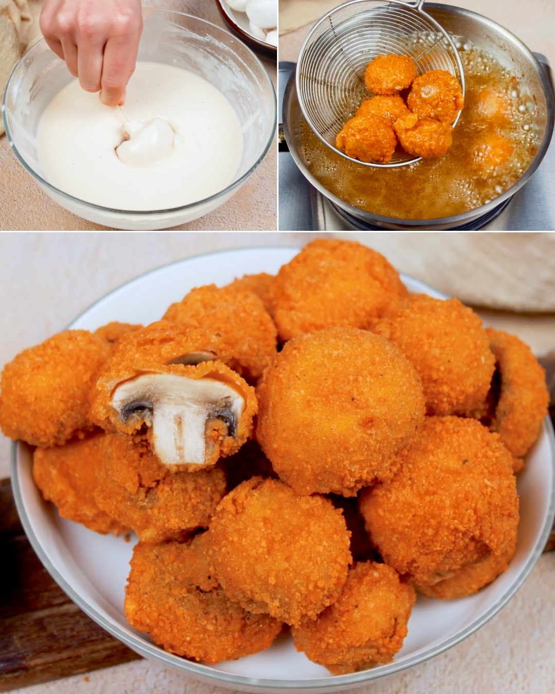 * Uvaljajte gljive u tijesto, a zatim u prezle tako da budu potpuno prekrivene.