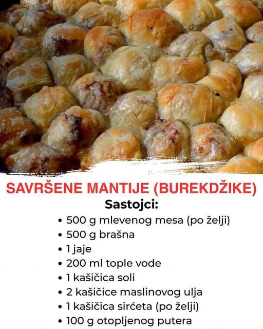 Burekdžike, poznate i kao mantiije, su ukusan i sočan tradicionalni recept koji potiče iz Balkana, a omiljeni su na mnogim prostorima. Služene kao glavno jelo ili predjelo, ove pite sa mesom i bogatstvima začina u savršenom su skladu sa hrskavom koricom. Savršene za sve ljubitelje tradicionalnih jela, burekdžike su pravo zadovoljstvo za nepce i jednostavne za pripremu.
