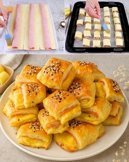 Razvucite lisnato tijesto na ravnoj površini. Oštrim nožem ili rezačem za pizzu podijelite tijesto na tri duge, jednake trake. Na svaku traku stavite kriške kuhane šunke, a preko sredine štapiće sira kako biste dobili sočan i ukusan punjeni dio.