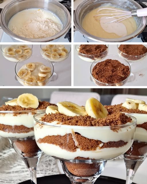 2. **Slaganje deserta:** Na dno posudica stavite sloj zdrobljenih biskvita. Preko toga stavite malo kreme i složite kolutove banane.