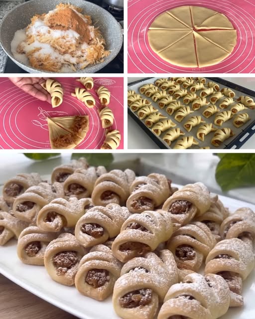 5. **Dodajte fil:** Svakom trouglu napravite 3 rezova i stavite po malo pripremljenog fila. Zarolajte tijesto u oblik rolnice.