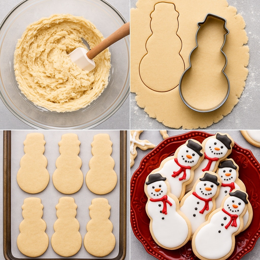 4. Izvadite tijesto iz frižidera. Odvojite 2 kašike tijesta i formirajte lopticu. Odvojite 1 kašiku tijesta i formirajte manju lopticu. Lagano spojite veće i manje kuglice da se malo zalijepe, ali ne spljoštite previše. Uvaljajte u šećer i stavite na pleh, razmaknute 5 cm. Ponavljajte dok ne formirate sve snowmane. Stavite u frižider na 30 minuta.