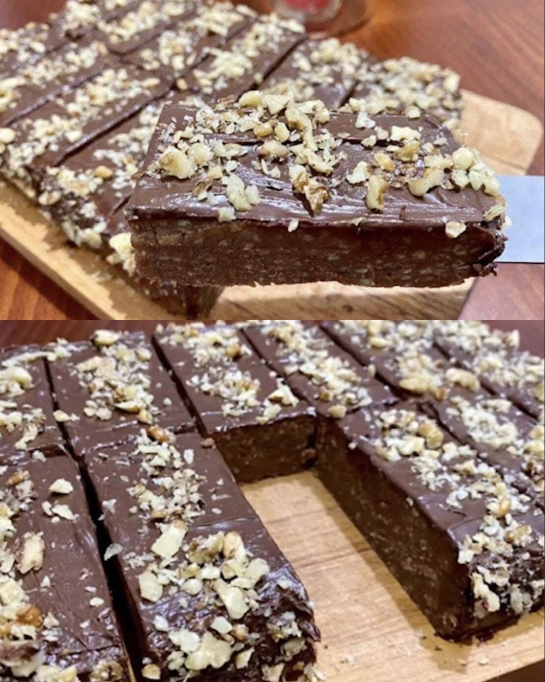 Nakon toga prevrnite ga na tacnu za serviranje i uklonite foliju. Premažite cijeli kolač Nutellom i pospite mljevenim ili sjeckanim orasima.
