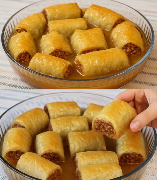 Staviti 4-5 jufki jednu na drugu ali svaku premazati puterom, i onda posuti smjesom kao na slici i saviti jufku kao za rolat.