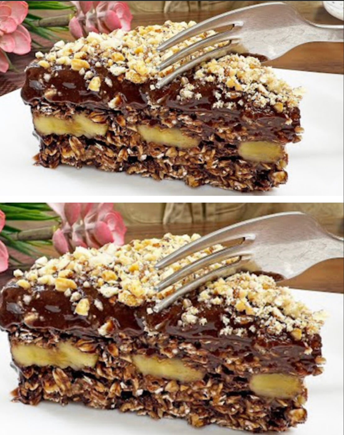Uzmite jednu veću bananu i narežite je na kolutiće debljine 2–3 mm. Poslažite kolutiće preko baze od zobenih pahuljica tako da prekriju cijelu površinu. Preko njih stavite drugi dio smjese.