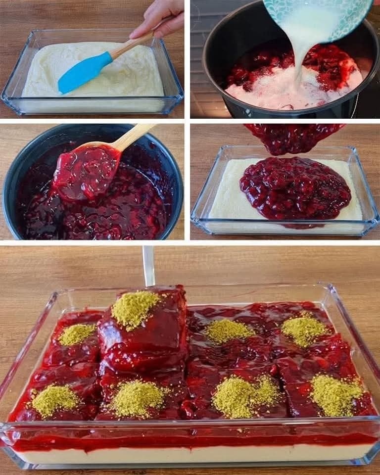 Sos od višanja prelijte preko ohlađenog griza i poravnajte spatulom. Vratite u frižider da se dobro ohladi.