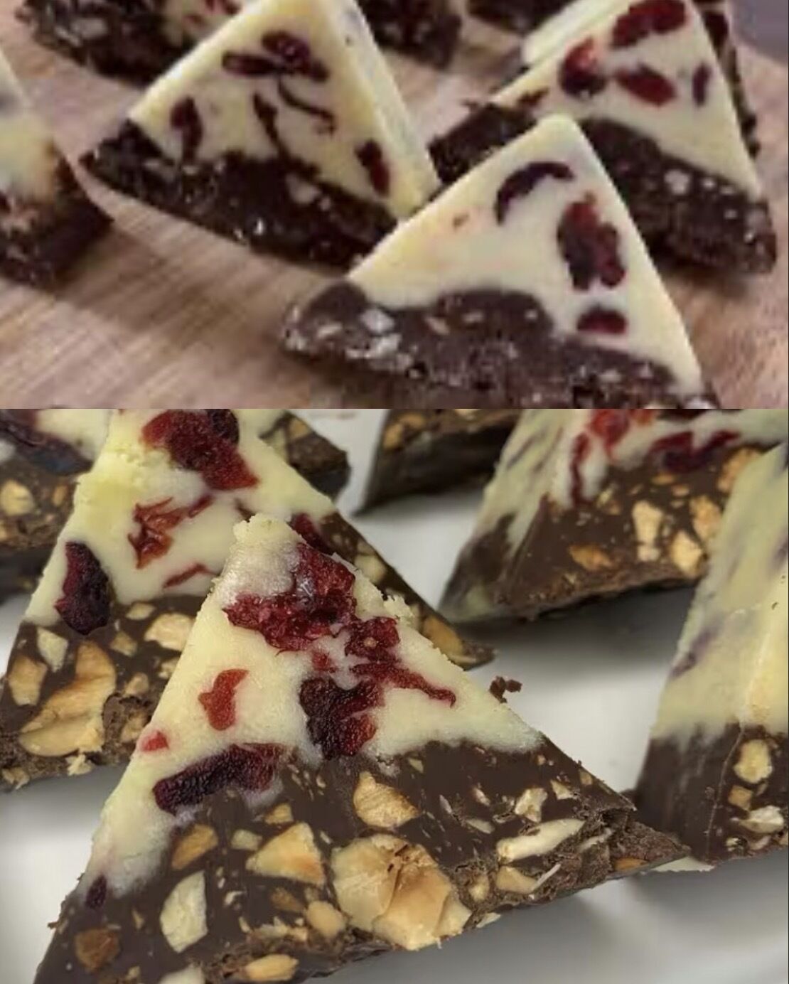 Dva slojevita fila – bijeli sa suhom brusnicom i tamni s prženim lješnjacima – stvaraju savršen sklad ukusa i tekstura, bez kapi šećera i bez pečenja.