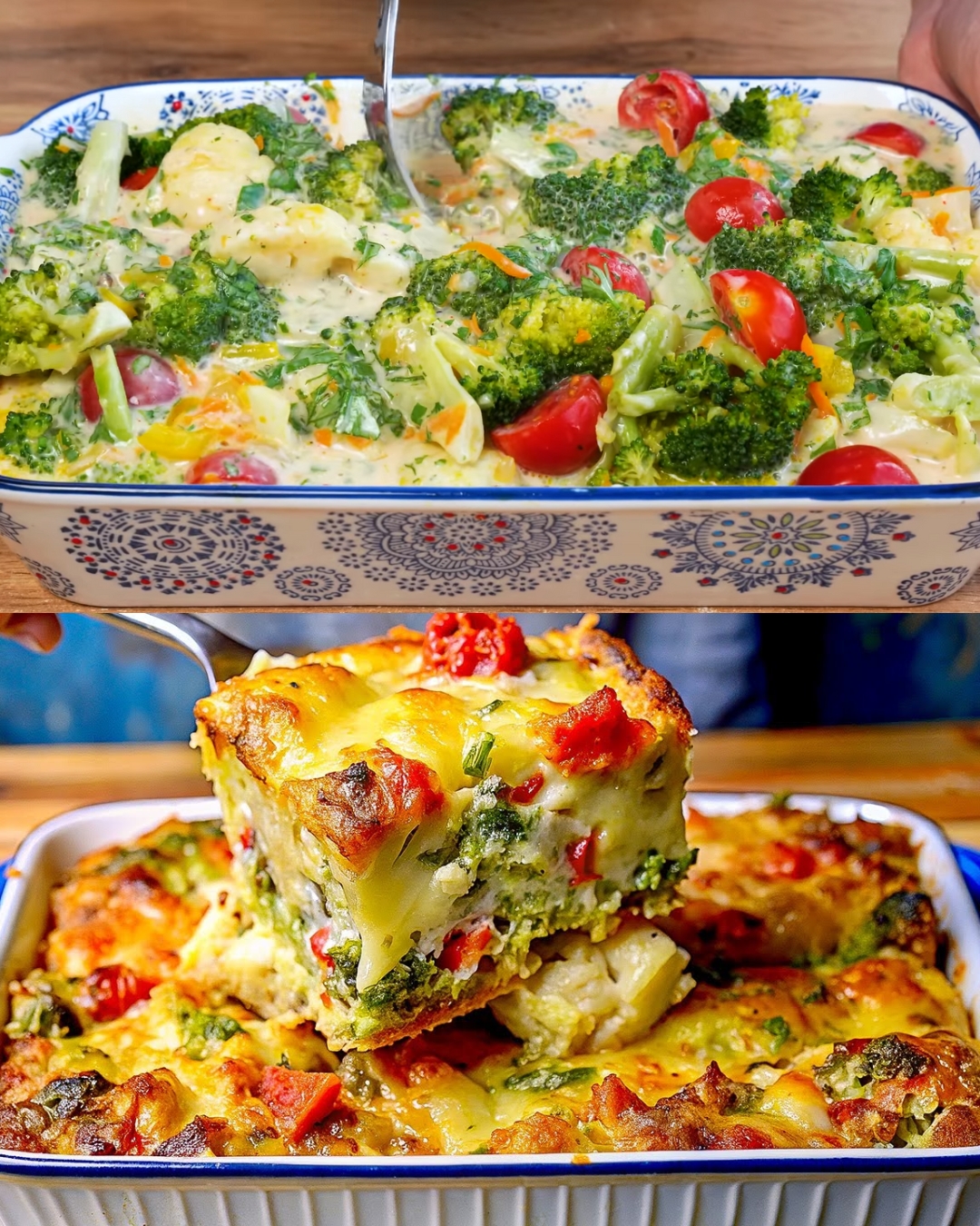 Ovaj zapečeni povrtnjak s brokulom i karfiolom savršeno spaja kremasti sir sa zdravim povrćem, dajući ukusan, zasitan obrok koji je i hranljiv. Recept kombinuje nježnu brokulu, karfiol, šargarepu, luk i papriku u bogatoj smjesi od jaja i mlijeka, prelivene otopljenim sirom koji formira zlatnu, mjehurićastu koricu. Idealan je za večeru, poslužen kao glavno jelo ili prilog uz pečeno meso, piletinu ili ribu. Jednostavan je za pripremu i pogodan za sve koji vole ukusno povrće u kremastom sosu.