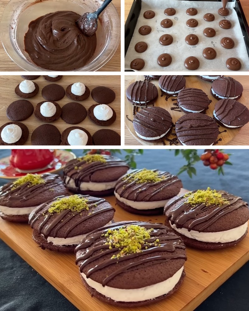Nakon što se biskviti ohlade, istiskujte šlag na jedan biskvit i prekrijte drugim.