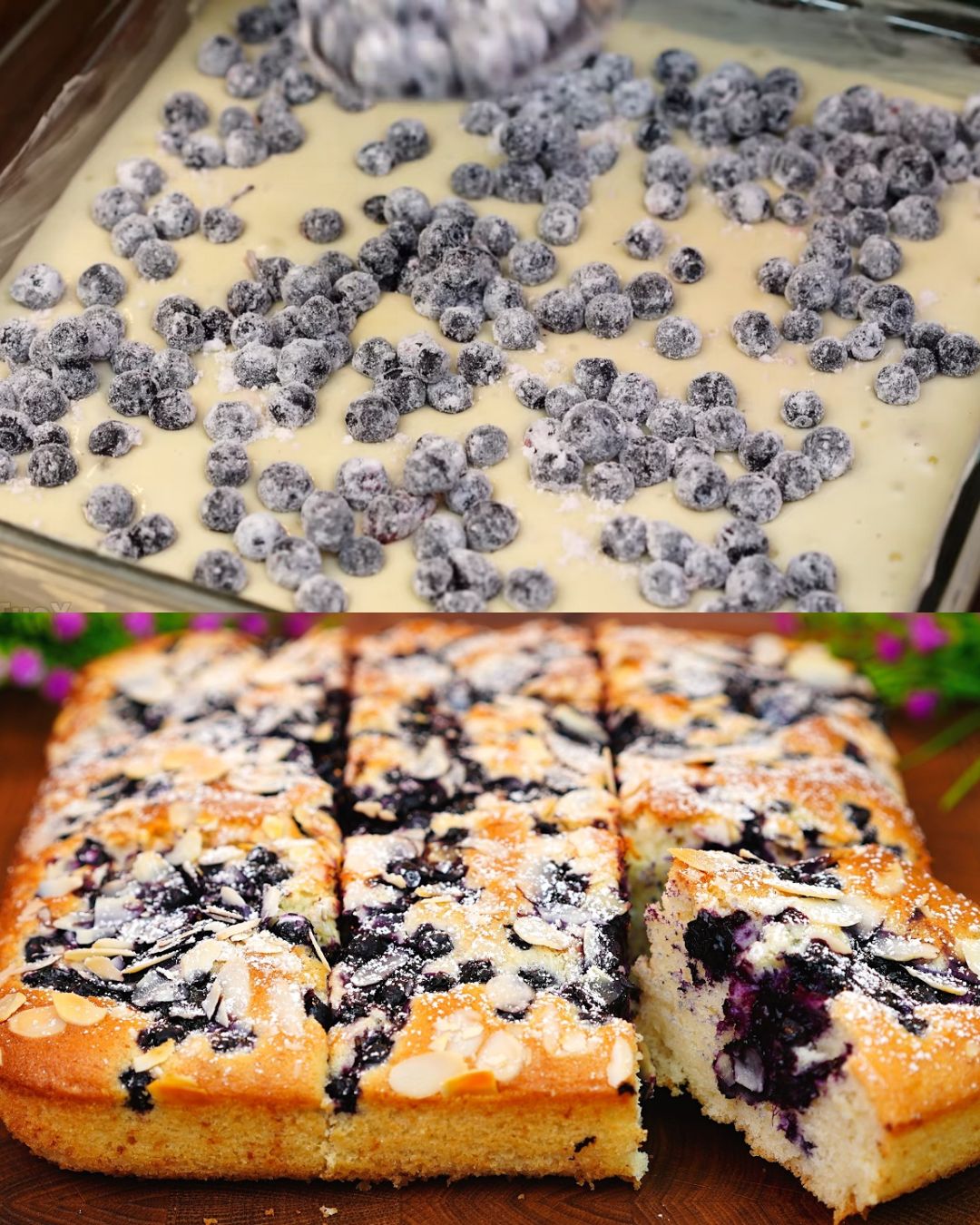 Pleh 21×21 cm podmažite ili obložite papirom za pečenje. Sipajte tijesto i poravnajte. Posipajte bobice preko vrha, pa dodajte bademove listiće.